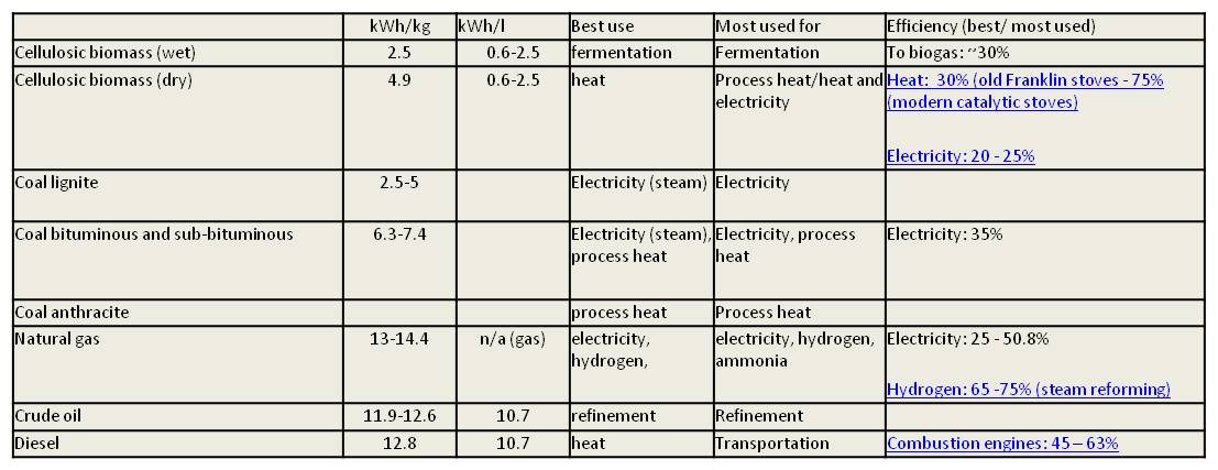 In order to understand possible consequences, we applied the lower efficiencies of biomass conversion to gross consumption of fossil fuels in the U.S. in 2008, based on end use. Approximately 143 quads of biomass are required to replace the 83.34 quads of primary energy consumption of fossil fuels – coal, natural gas and crude oil (Table 4). This handicap is not due to lack of appropriate technology, but simply related to the chemical properties of the materials involved, e.g. state (solid, fluid, gaseous) and energy density of the different sources. With significant shifts to better pathways, for example by heating more homes with wooden biomass directly, we might improve the situation slightly, but never fully, and always at the cost of significant technology investment.