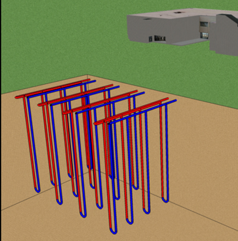 In the summer the flow is reversed. The hot water from the heat exchanger/chiller is returned to the wells through the red lines, releasing the heat into the ground and cooling before it returns back to the surface through the blue line, and into the chiller/heat exchanger to provide a cooling source for the campus.