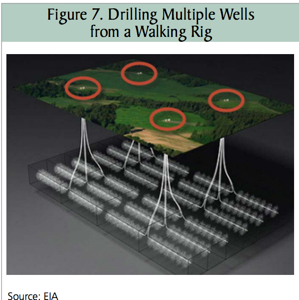 The “walking rig” is one technological advance that has contributed greatly to gains in rig productivity. Rather than drill a single well from a well-pad, a walking rig can move around the pad, drilling multiple wells (sometimes dozens)