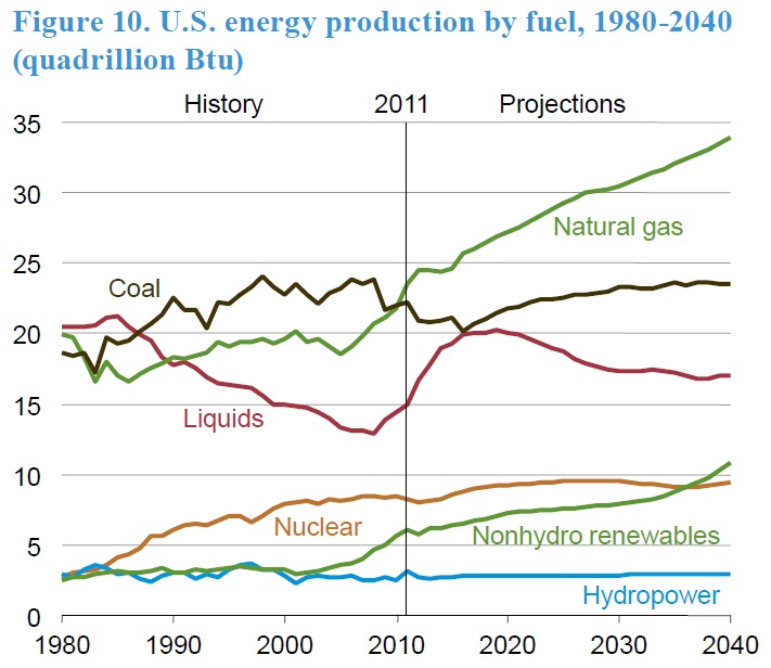 The graph to the right shows that U.S. energy production is climbing and will continue to climb through the end of the decade. Far from peaking, oil production is climbing and will “peak” later this decade, but will level off for the next two decades. It doesn’t decline as the peak oil theory predicts.
