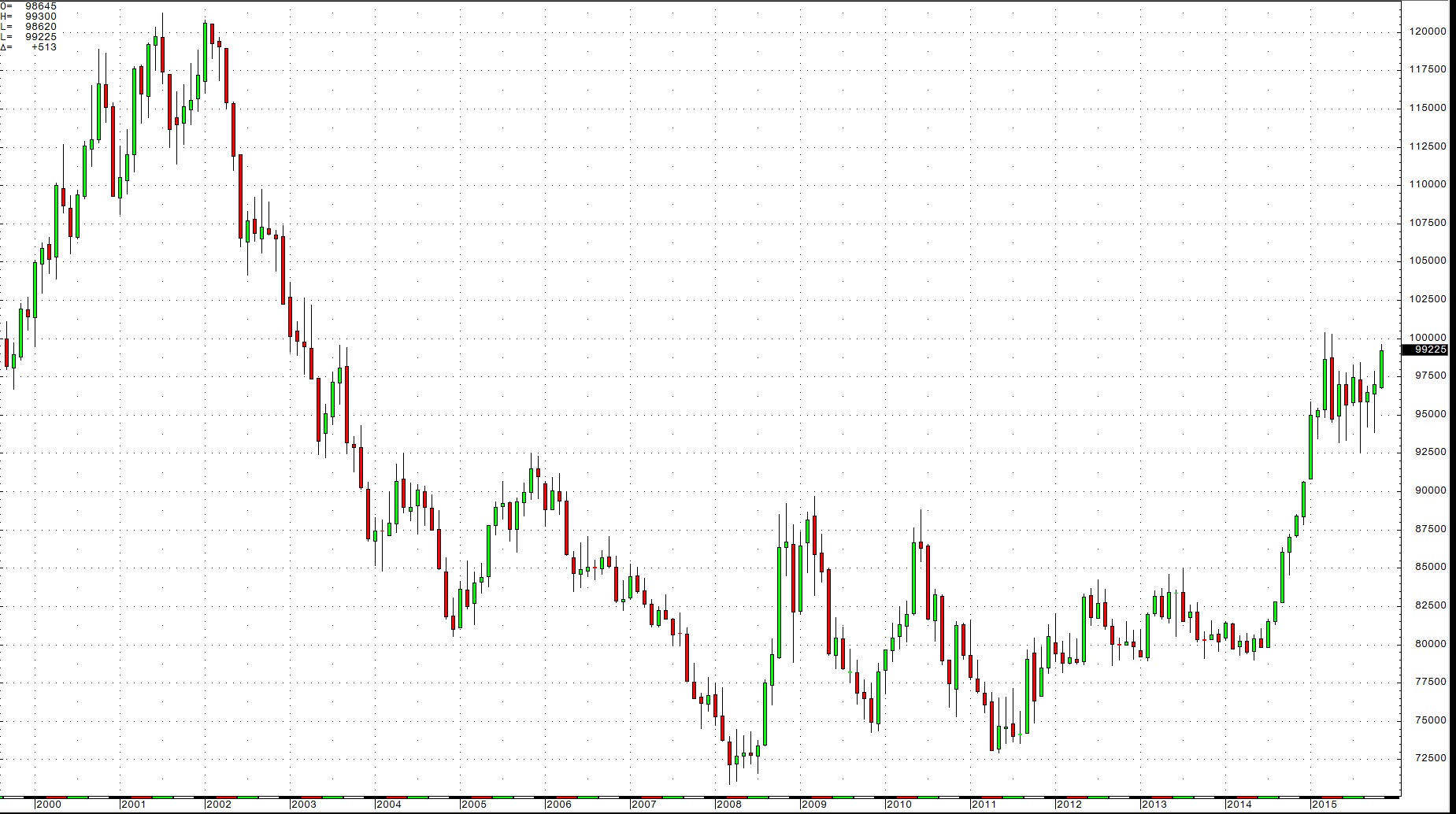 As the monthly chart illustrates, the dollar appreciated by over 27% between May 2014 and March 2015. After a six-month period of consolidation, the dollar is now threatening to make new highs above the 100.38 level.