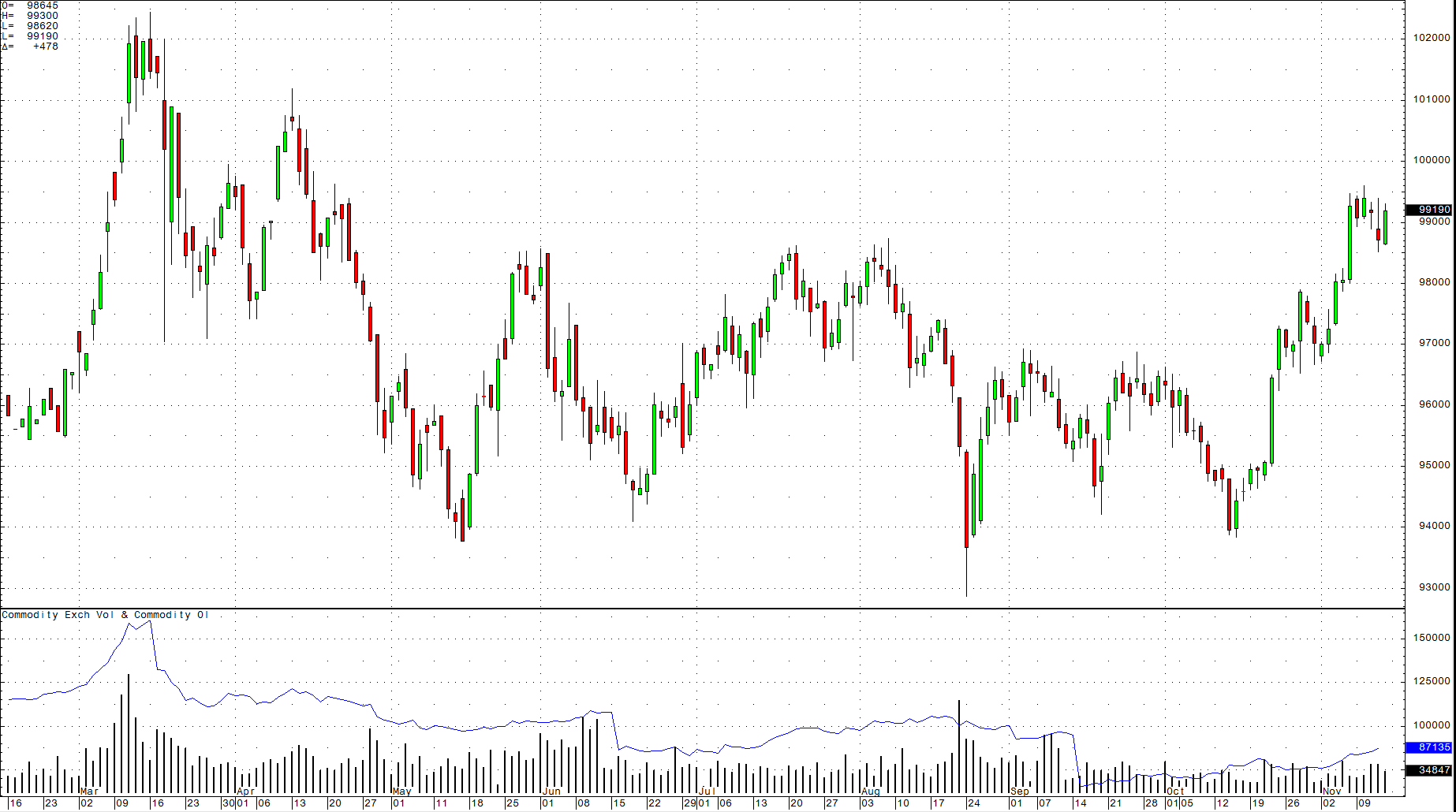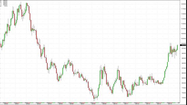 Last week, the dollar index made a higher short-term high on Tuesday when it traded up to 99.60 on the active month December futures contract. On Wednesday and Thursday, it corrected a bit. During the period of the correction, statements from the ECB President Mario Draghi indicated that the dove on interest rates is becoming even more dovish. In what was likely a delayed move, the dollar index rebounded on Friday, November 13 to close the week at over 99 once again.