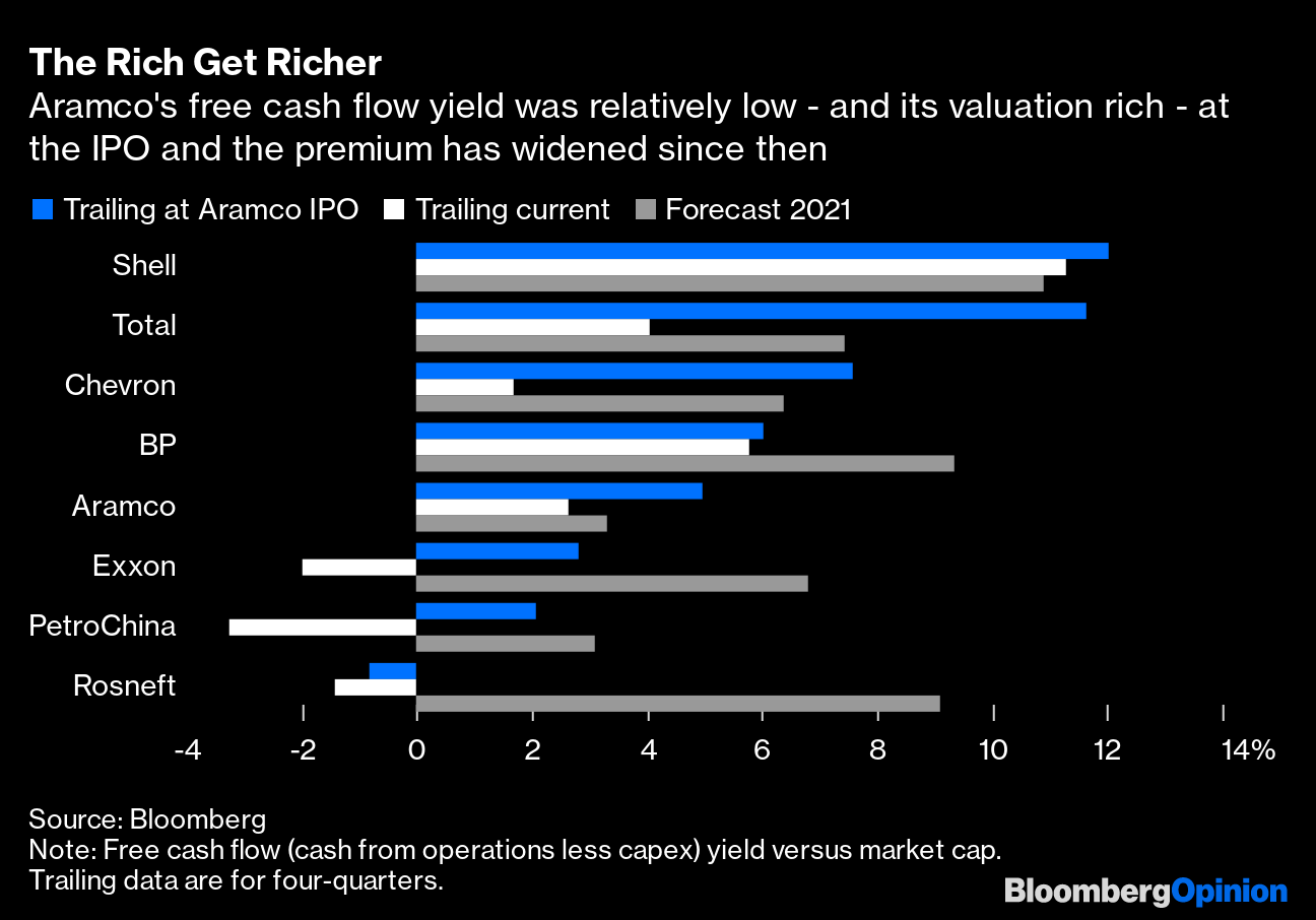 Aramco isn’t quite at Crown Prince Mohammed Bin Salman’s magic $2 trillion level (it hit that briefly soon after the IPO), but its premium has expanded this past year. Even at the start, Aramco’s $1.7 trillion valuation looked rich (see this and this). One global catastrophe later, it looks even richer.