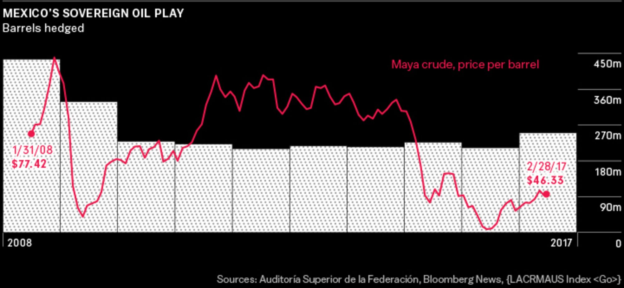 Mexican officials have argued that the hedge, which runs annually from Dec. 1 to Nov. 30, doesn’t affect prices. However, bankers who are or have been involved in the deal, as well as oil traders who monitor it closely, say Mexico’s hedging, in fact, roils the market. That certainly happens when Mexico’s bankers sell futures to protect themselves, putting downward pressure on oil prices. If only because of its magnitude, the hedge is a fount of rumor, chatter, and volatility—particularly when Mexico is hedging and the market is falling, as in 2008 and again in 2014.