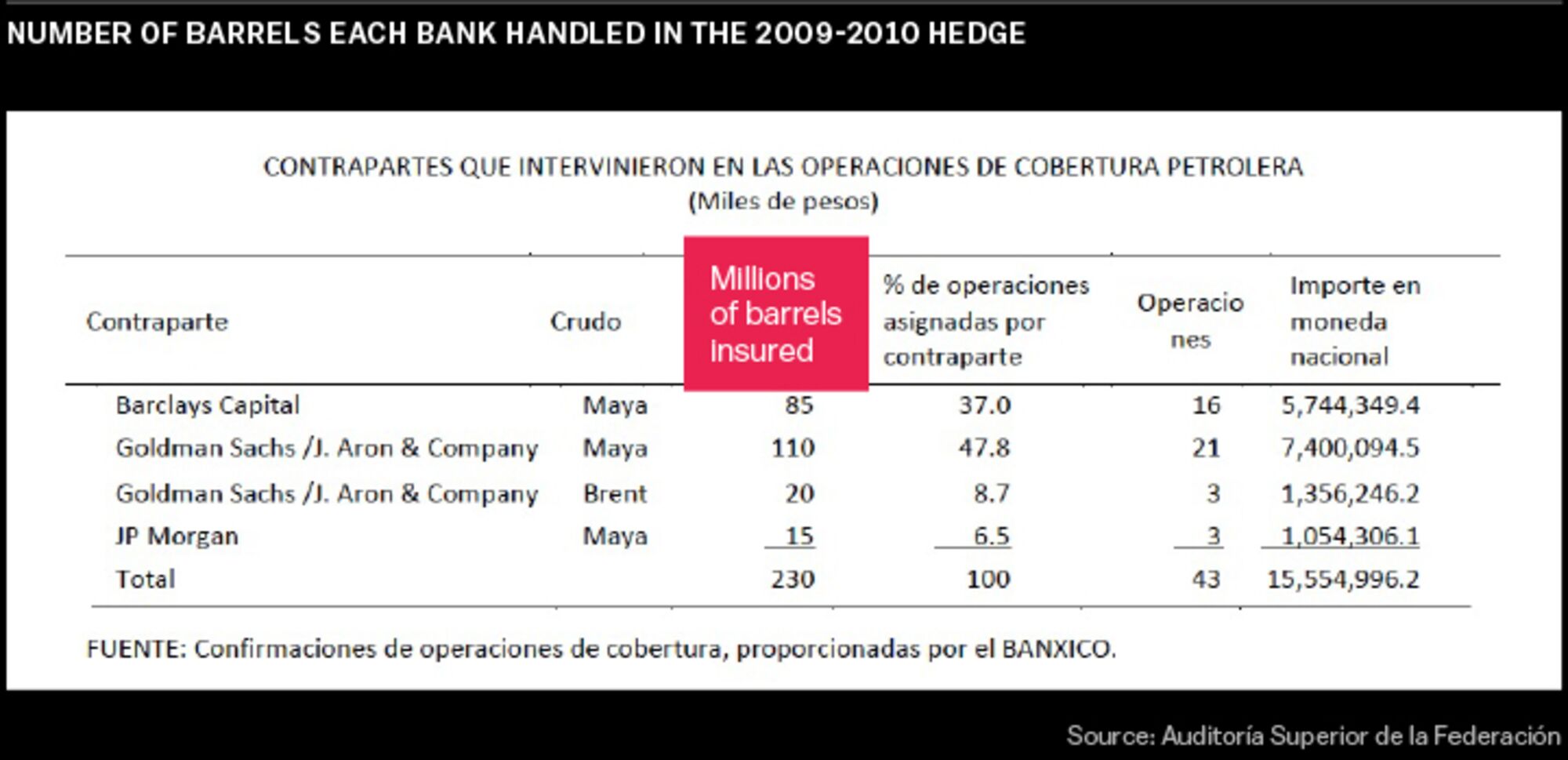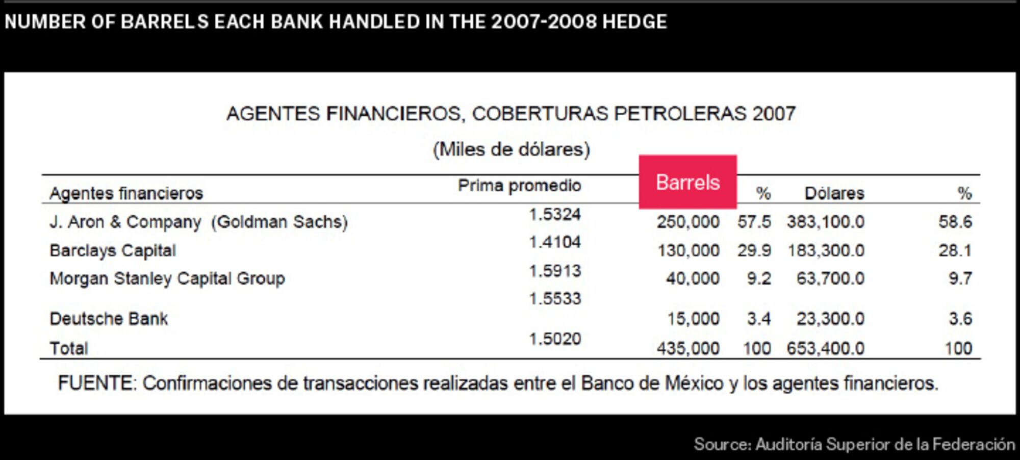 Despite its size, impact, and huge fees, the deal is one that few people, even in the energy industry or on Wall Street, know much about. Painstakingly, the world’s 12th-largest oil producer and its bankers have cloaked the program in secrecy to prevent others—namely trading houses and hedge funds—from front-running Mexico’s orders. “Minimizing its visibility is extremely important,” wrote Javier Duclaud and Gerardo García, two senior officials at Mexico’s central bank, in a 2012 report for the International Monetary Fund.