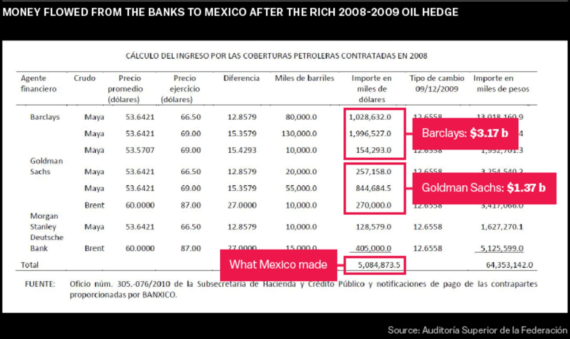 In December 2009 the four investment banks involved in the deal wired the proceeds of the wager back to Mexico. Official records tracking the money that landed in Account No. 420127 at state-owned Nacional Financiera bank show the tidy sum Mexico made: $5,084,873,500.