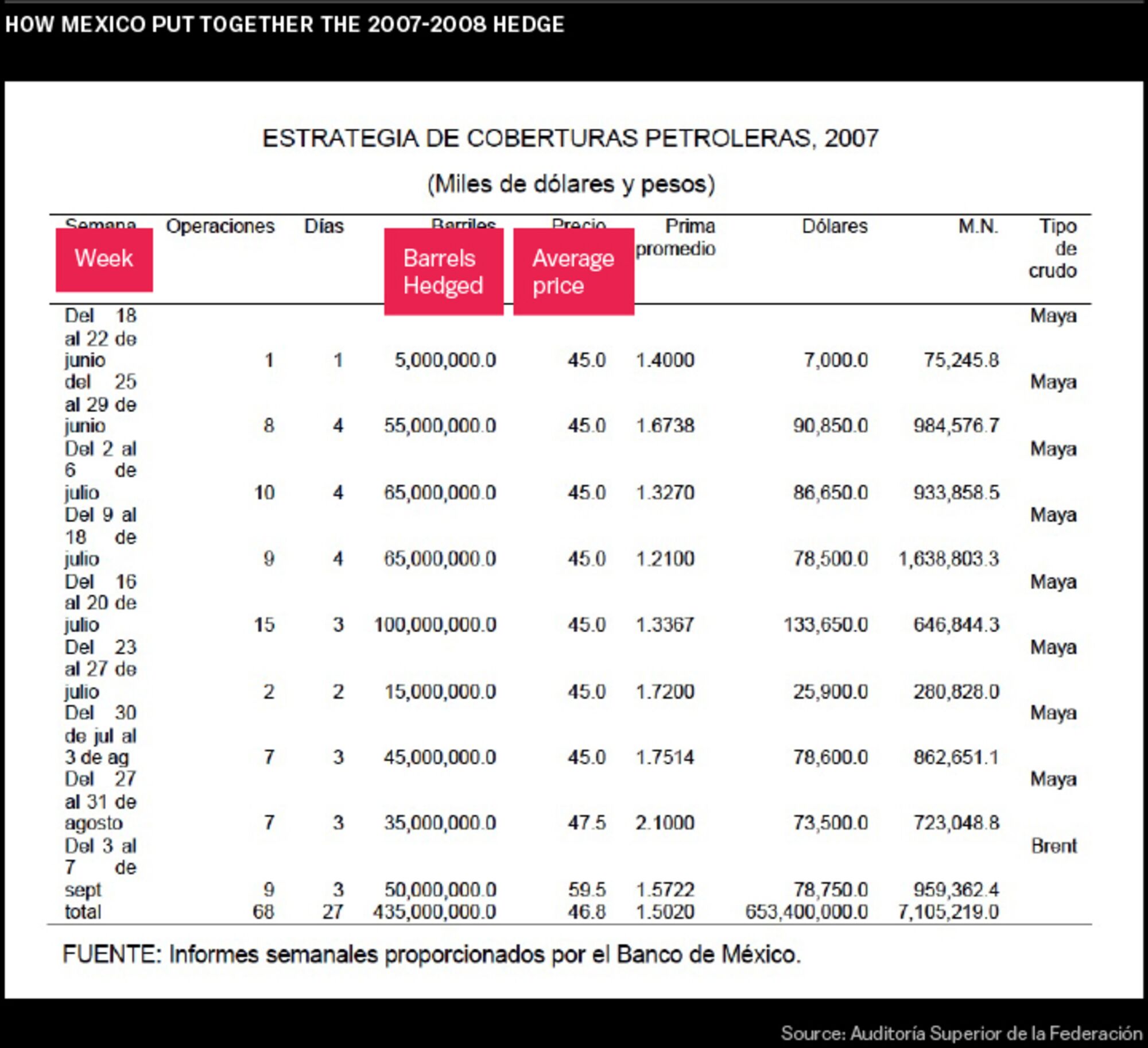 Until 2009, the Mexican government didn’t disclose any information about the Hacienda hedge. Since then, its practice is to disclose as little as possible. And the banks? They never publicly acknowledge their participation in deals like this. Still, for all the Mexican government’s efforts to keep its megahedge hidden, a detailed history of how the deal works can be gleaned from the thick, bound volumes of the legislature’s annual audit, the Auditoría Superior de la Federación. Among other insights, the thousands of pages reveal that Mexico’s current practice is to buy so-called Asian-style put options. That allows the country to hedge an average price rather than the price at the expiration of the contract, as is the case with “American-style” options.