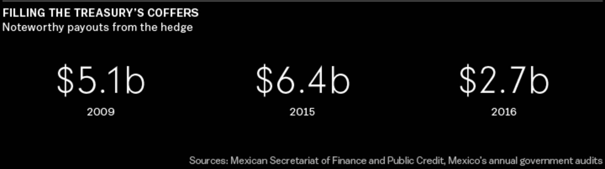 Mexico’s oil hedge has real economic significance. Until fairly recently, the country relied on oil for about a third of its income, leaving it dangerously exposed to boom-and-bust price cycles. According to current and past government officials, the main purpose of the hedging is not to pad the country’s coffers but rather to protect the federal budget from fluctuations in oil prices.