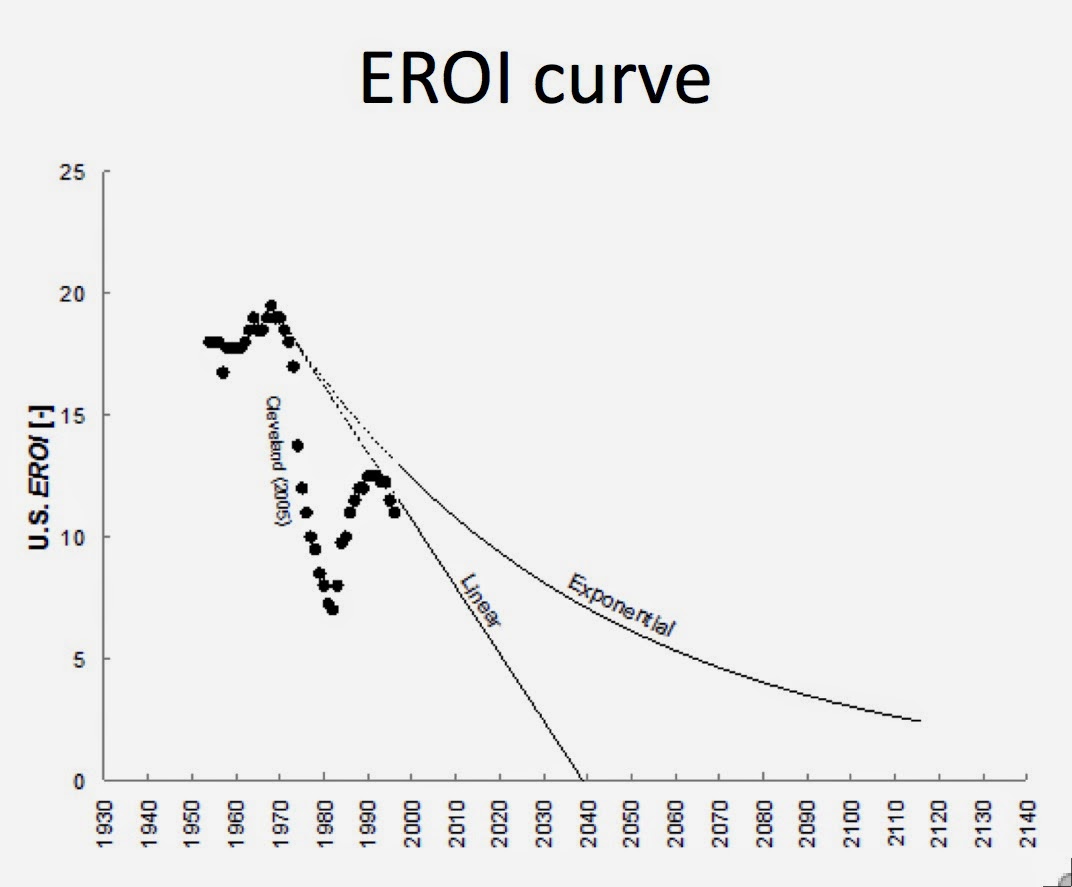 Meadow’s talk included a chart showing the catabolic step we might expect of climate change about mid-21st century. He pointed out that whenever such large shifts in temperature occurred in Earth’s history, they were not gradual, coming in lurches, rather than smooth waves. He gave the example of a reagent being slowly added to a beaker until suddenly, saturation is reached and color or something else abruptly changes. The smooth comfort of the Hubbert sine wave is unlikely when net energy extraction or compounding climate feedbacks are considered.