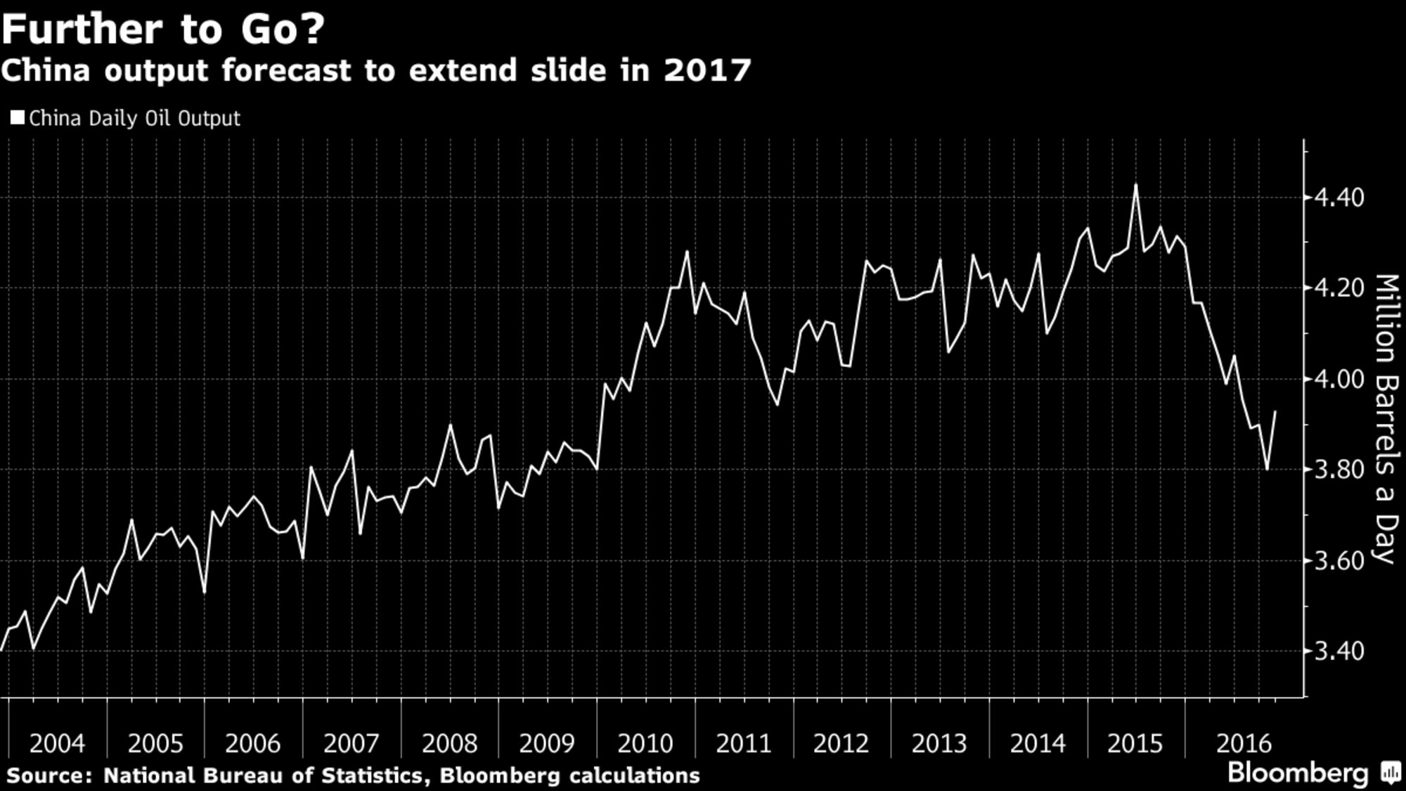 China’s production is forecast to fall by as much as 7 percent this year, extending a record decline in 2016, according to analysts at CLSA Ltd., Sanford C. Bernstein & Co. and Nomura Holdings Inc. That’s about the same size as the output cut agreed by Iraq, the second-biggest producer in the Organization of Petroleum Exporting Countries, which late last year reached a deal to trim supply to support prices.
