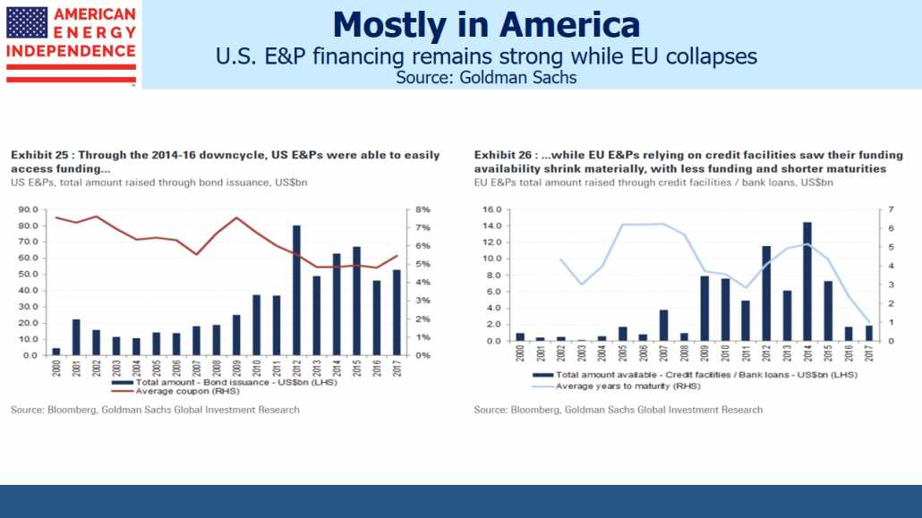 Because less risky, short-cycle projects are mostly shale plays in the U.S., a stark difference in financing has opened up between America and Europe. EU bank financing for Exploration and Production, always far smaller than in the U.S., has collapsed in recent years.