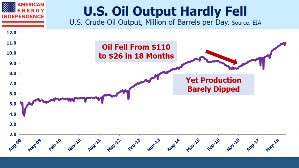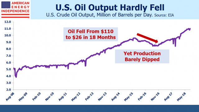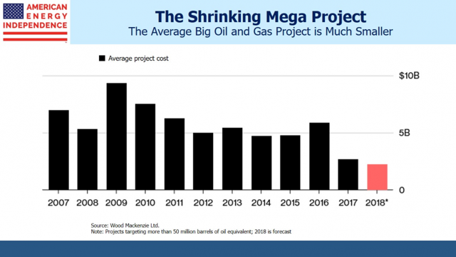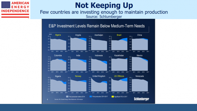 Following the oil price crash 2014-15, energy companies adopted greater financial discipline and planned for lower oil prices in the future. The combination of higher required returns and lower assumed prices has had a chilling effect on investment. The U.S. Shale Revolution is at least partly responsible. U.S. output barely dipped during the 2014-15 collapse. Although low prices weren’t sustained for long, the episode caused subsequent projects to be evaluated against the possibility of a repeat. For example, in April BP’s chairman said they were, “still working with the assumption that this is going to be a world with an abundance of oil.”