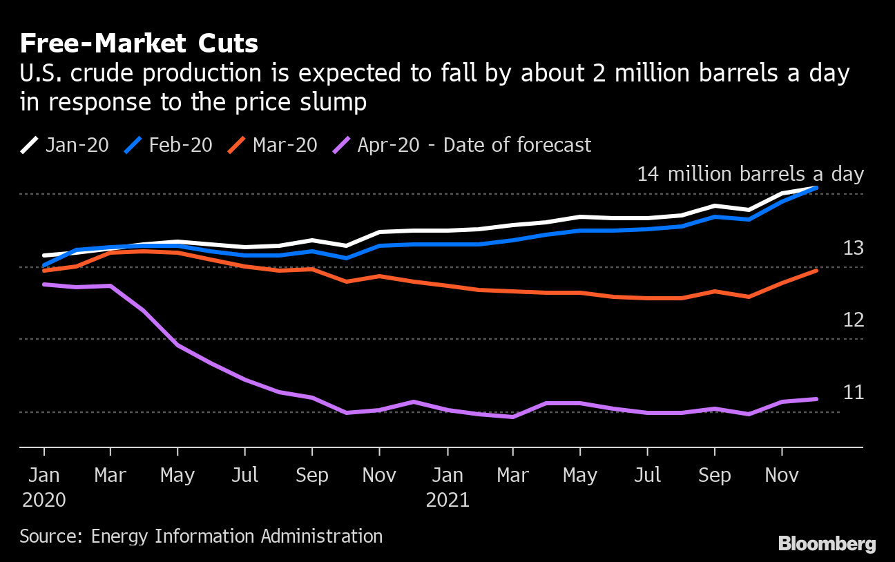 U.S. oil demand has now fallen to 14.4 million barrels a day, the lowest in data going back to 1990 and a drop of more than 30% from pre-crisis levels, government figures showed Wednesday. In its short-term outlook, the EIA forecast the hit to oil demand will be 16.7 million barrels a day in April. A number of U.S. refiners, including HollyFrontier Corp. and Marathon Petroleum Corp., cut run rates by 30%.