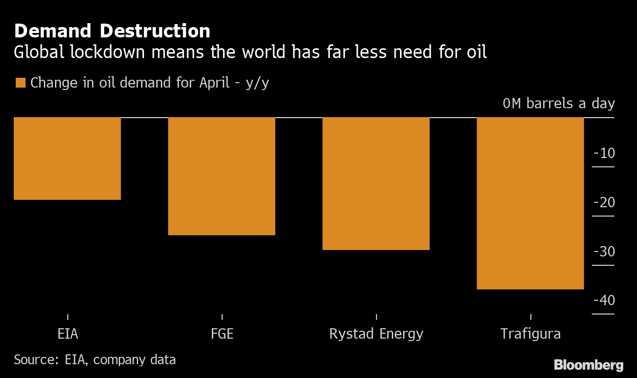 Demand for crude could fall by 27 million barrels a day this month, according to Rystad Energy AS, while Trafigura Group estimates the current hit to consumption is around 35 million barrels a day.