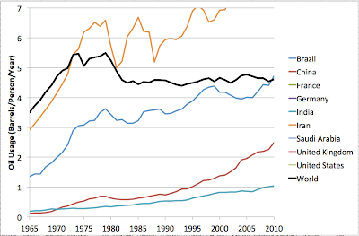 At least not in the US.  In Saudi Arabia, they are apparently having tons of fun with consumption having shot up to a staggering 40 barrels/person/year in the last decade.  Iran too has experienced sharp growth in consumption, albeit from a lower level. Though I imagine the beach parties aren’t quite the same when the girls have to wear burqas.