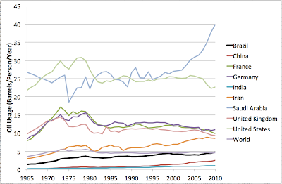 The graph illustrates how developed countries have seen a decline in oil consumption per capita since the 1970s. Europe has experienced a gradual decline since the mid-90s, while the US saw a more abrupt decline starting in 2005.