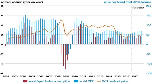 For the current cycle, we have been experiencing global economic growth rate of about 3% since 2008. In the past nine years since 2008, global demand for crude oil and production increased by about 6 mb/d, or about .9% per year, according to EIA data. I am looking at crude oil only, not total liquids for this exercise. If we look at how the reality of the current economic cycle fits in with my formula, we see that it is a pretty good fit.