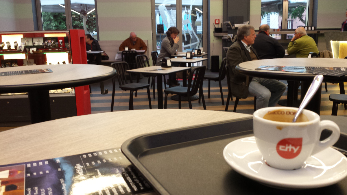 Then, there are high-speed trains; wonderful machines that could compete with planes even for relatively long trips. At a speed typically over 200 km/hour, a train could cover the ca. 1500 km from Rome to Berlin in some 6-7 hours. Of course, you should add the time for a few stops along the way and the fact that not the whole network allows for high speed. Still, you could likely make it in less than 10 hours; which is reasonable for a comfortable daytime trip, where you can relax and work while you travel. But, in practice, there is no way to get to Berlin from Rome or Florence in a single day. My train trip to Berlin started from Switzerland; it was less than 1,000 km and it took more than 11 hours; an average speed of less than 100 km/h. The reason is that I had to change three times and that involved considerable idle time in stations (image: a coffee shop in Bellinzona, Switzerland. Nice place, and they had good Italian espresso coffee, but it was a lot of lost time)