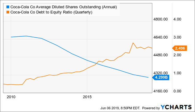 Let’s look at Coca-Cola (KO) just as an example. In the last 10 years, the company’s share count dropped significantly while its total debt and debt-to-equity ratios skyrocketed. Why? You guessed it correctly: the company took on debt to buy back more shares. This is not just a Coca-Cola problem as we see this in almost every blue chip out there.