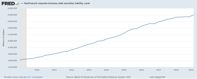Corporate debt has been rising across the board for the last decade. This behavior was driven by easy money policies of central banks around the world and these policies didn’t help the average person much. In the graph below, you’ll see the non-financial corporate debt of American companies collectively. Companies will continue to engage in this behavior for as long as they can get away with, which means we’ll be seeing anemic growth and low capital investments for a long time to come.