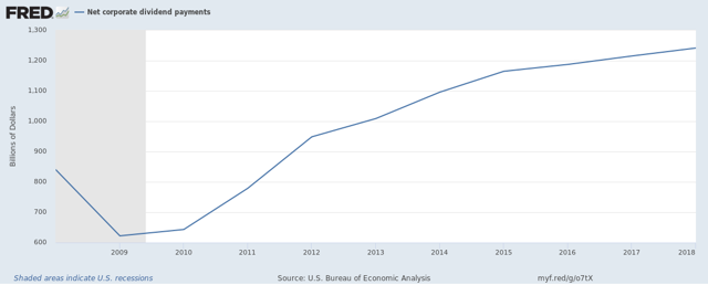 Dividend growth is also likely to be anemic moving forward. The chart below shows the total corporate dividends in a given year in American stocks, and while the line has been growing year over year, you can see that the growth has been flattening. In 2011 and 2012, the average dividend growth was 22% and this rate dropped to 7% between 2013 and 2016. Since 2016, the average annual dividend growth rate is 2.15%. Where will future dividend growth come from when companies have 60-70% payout ratios as it is?