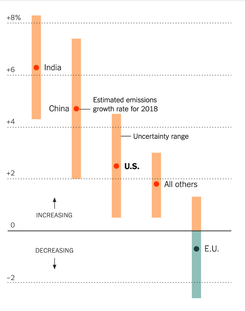 Then a second shoe dropped mid-week in a report from the Global Carbon Project that The New York Times described under the headline, “Greenhouse Gas Emissions Accelerate Like a ‘Speeding Freight Train’ in 2018.”