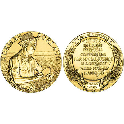 The details of how we might continue this sort of progress through 2060 are also complex and will involve new challenges such as climate change. Even so, on this important anniversary it is fitting to look back at the remarkable accomplishments of the past to find inspiration for the challenges of the future. Lets hope that at the 150th anniversary of Norm Borlaug’s birth people will once again be able to look back and tell this kind of story. A story about humanity continuing to be fed, but without having had to add much if any new farmed land. Even into his 90s, Borlaug continued to be an articulate proponent for letting farmers use the full toolbox of technologies, including biotechnology, to pursue such goals. Now its up to us to continue to make that case. Image of the Norman Borlaug Congressional Medal from Wikimedia Commons.