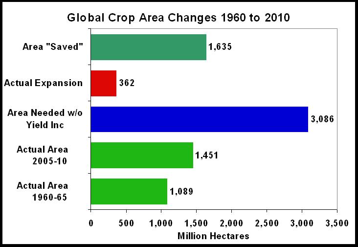 The increase in food production during Borlaug’s era was mostly achieved through increased yield on each acre or hectare grown, not from farming more land. That was made possible by agronomic improvements, including the breeding advances that came from the work of Borlaug and many others. In the graph above, the two bottom, green bars show the global crop area in the window 1960-65 (1.09 billion hectares) and 2005-10 (1.45 billion hectares). The increase, shown in the red bar, is 362 million hectares. That is an enormous amount of land, but without increased yield, it would have taken nearly 3.1 billion hectares (blue bar) to have provided the amount of food that was available to the world by 2010. That effectively means that the global farming community, and those that aided it with technologies, advice and expertise, “saved” more than 1.6 billion hectares of land from being converted from a natural state into farmland. Realistically, there is not that much land which could ever be farmed.