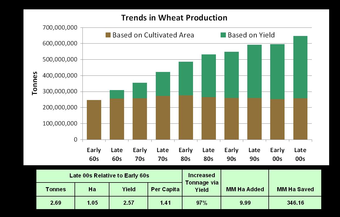 Many of Borlaug’s contributions were to the staple food crop – wheat. Wheat is not a single crop, but a collection of many different types of wheat grown for different kinds of food ranging from hearty breads, to pasta, to crackers, to flat breads to soft noodles. By the end of this 50 year window, the world’s wheat farmers were producing 2.69 times as much wheat as in 1960. However, 97% of that increase (green part of the bar) was enabled by higher yields. Only 10 million more hectares were being grown. That meant that the world could continue to have enough wheat without the need for adding 346 million more wheat hectares. That is the legacy of Borlaug and the other participants in the Green Revolution.