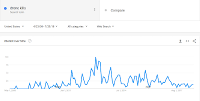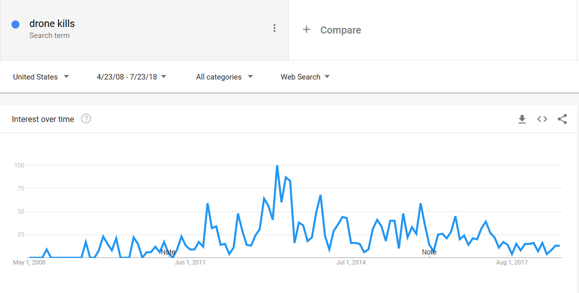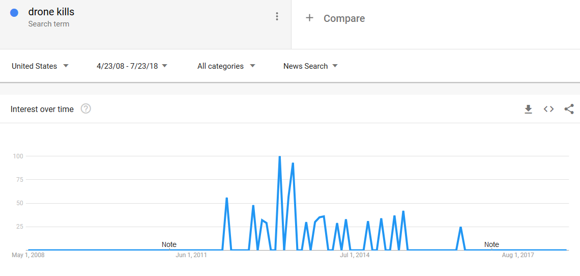 There is no easy way to measure the press coverage of a specific event or series of events, but we can use Google trends for an indirect measurement. Here is the same term, “Drone kills” measured in terms of the click on the “News” section of the Google search engine.
