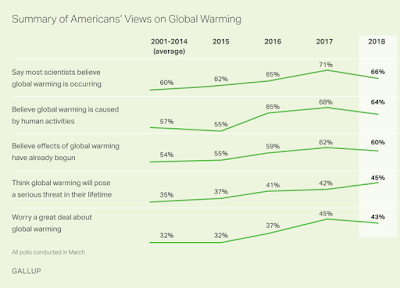 Here, we don’t see the same evident decline in interest we saw for the case of “drone kills,” but I think it is reasonable to say that there has been a detectable decline during the past year or so (note that the 2017 spike corresponds to Trump’s announcement that the US would withdraw from the Paris Climate Treaty). This interpretation may be confirmed by the most recent Gallup poll. Again, the declining trend is still uncertain, but it seems to be there. In March 2018, Americans were less convinced that climate change is a threat than they were in 2017.
