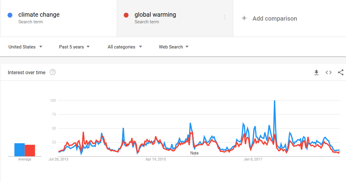 Let’s see now how the same mechanism may be at work in the case of global warming and climate change. First of all, here are some results from Google Trends.
