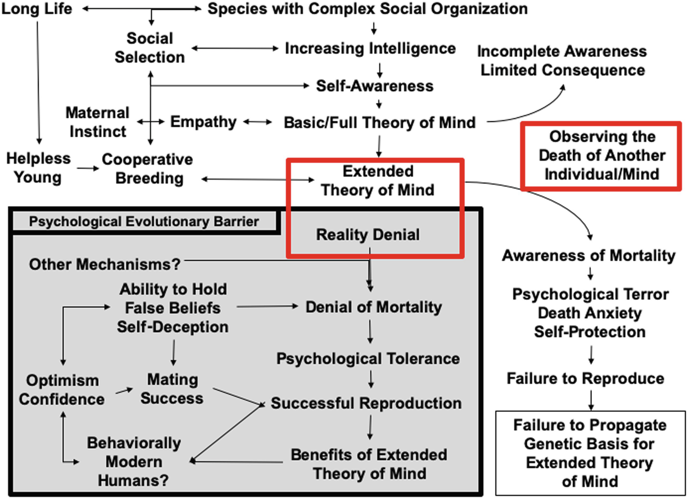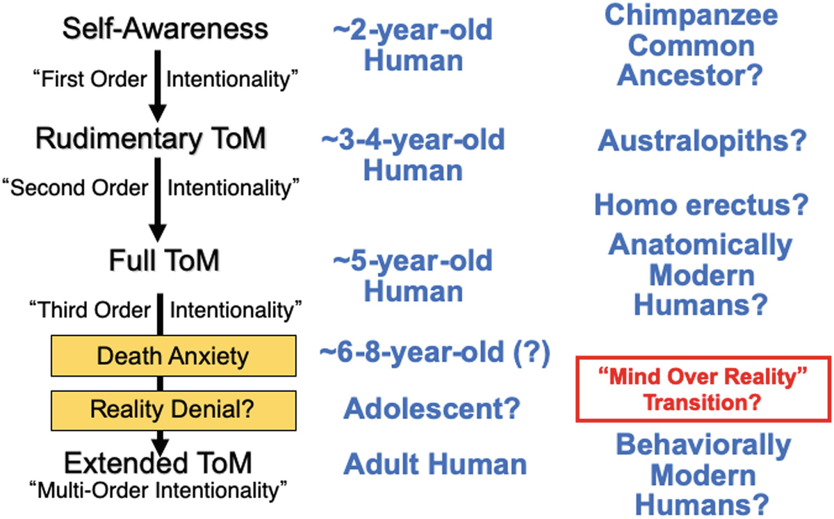 Some aspects of human cognition and behavior appear unusual or exaggerated relative to those of other intelligent, warm-blooded, long-lived social species — including certain mammals (cetaceans, elephants, and great apes) and birds (corvids and passerines). One collection of such related features is our remarkable ability for ignoring or denying reality in the face of clear facts, a high capacity for self-deception and false beliefs, overarching optimism bias, and irrational risk-taking behavior (herein collectively called “reality denial”). Such traits should be maladaptive for reproductive success when they first appear as consistent features in individuals of any species. Meanwhile, available data suggest that self-awareness (knowledge of one’s own personhood) and basic theory of mind (ToM, also termed mind-reading, intentionality, etc.) have evolved independently several times, particularly in the same kinds of species mentioned above. Despite a long-standing opportunity spanning tens of millions of years, only humans appear to have gone on to evolve an extended ToM (multilevel intentionality), a trait required for optimal expression of many other unusual cognitive attributes of our species, such as advanced linguistic communication and cumulative cooperative culture.