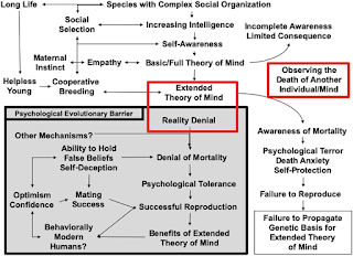 Most human behaviors exist in other species on a continuum of development, as one would expect from evolution. But religion appears to be a well-established near universal only in human cultures and there are many obvious fitness advantages that have been discussed by others. But most of these advantages should not require a belief in life after death. Nevertheless, almost all religions have at their core some form of such afterlife beliefs, which would serve as another mechanism to blunt the impact of mortality salience. Of course, atheists do not live in constant fear of their mortality, so the underlying reality denial appears to be the primary mechanism.