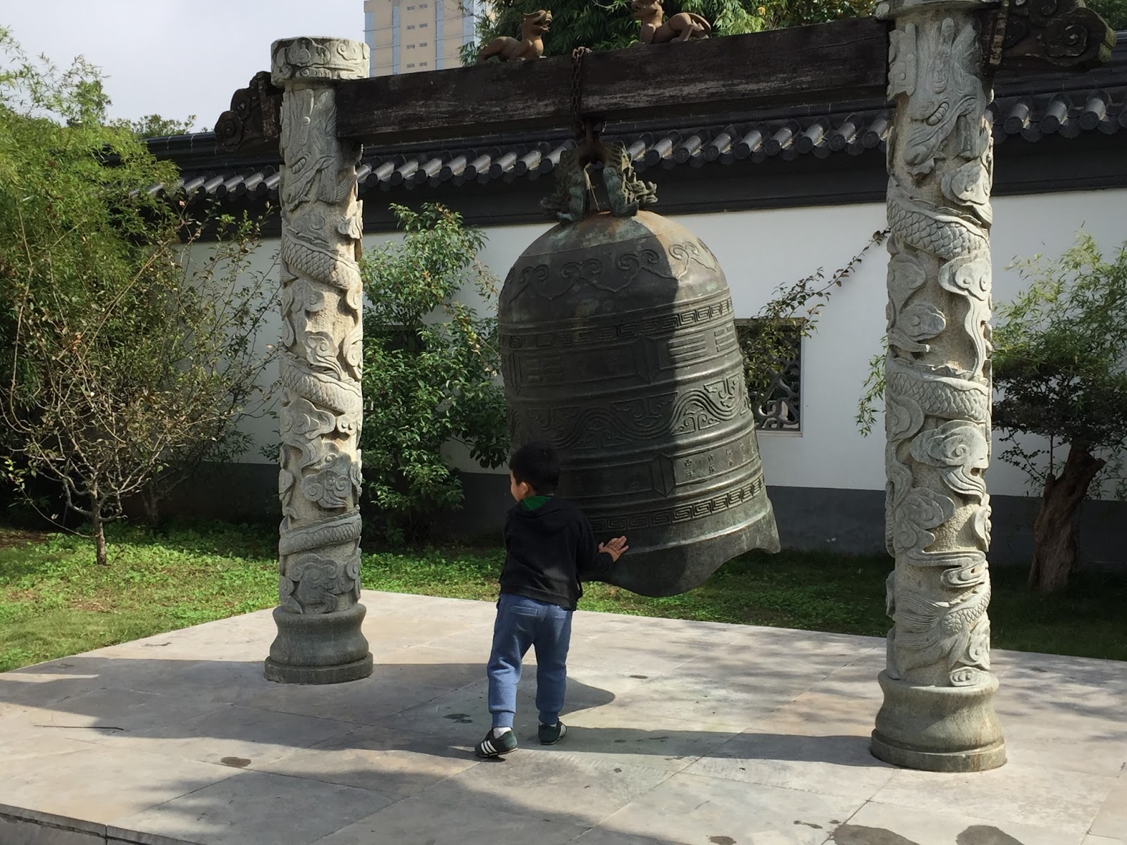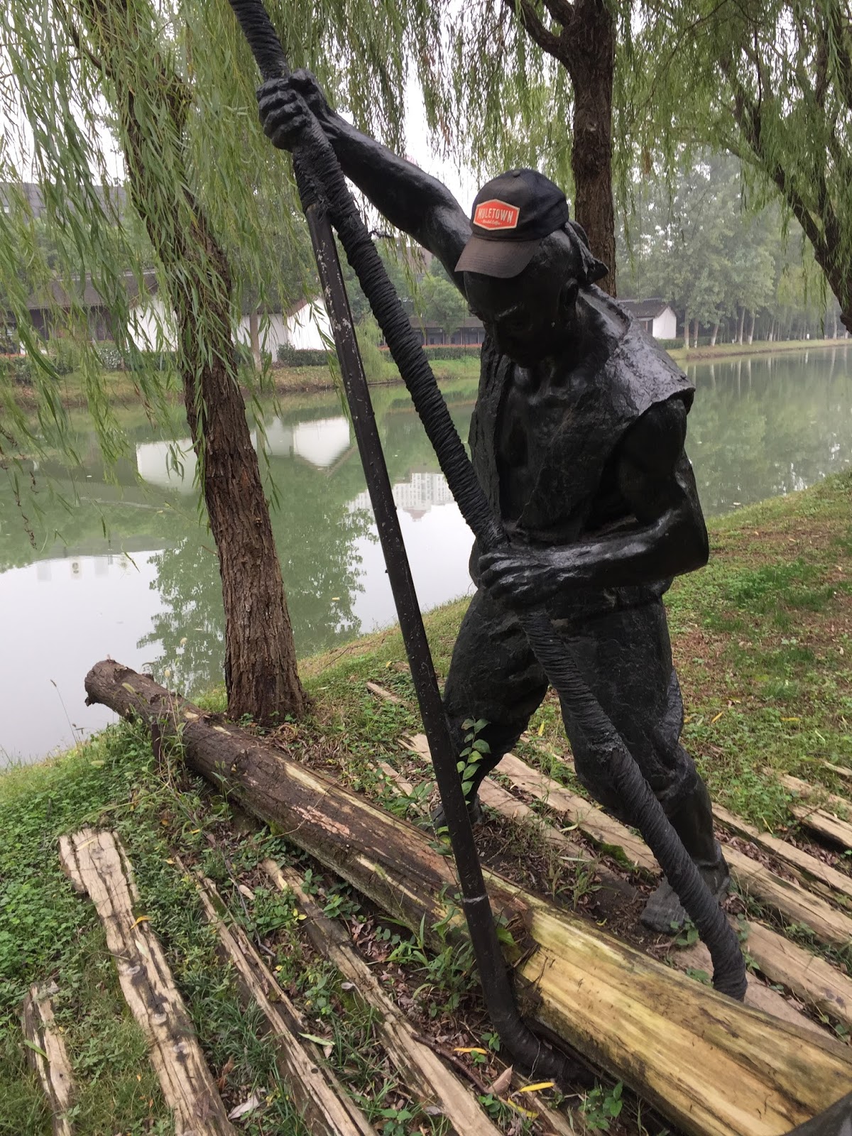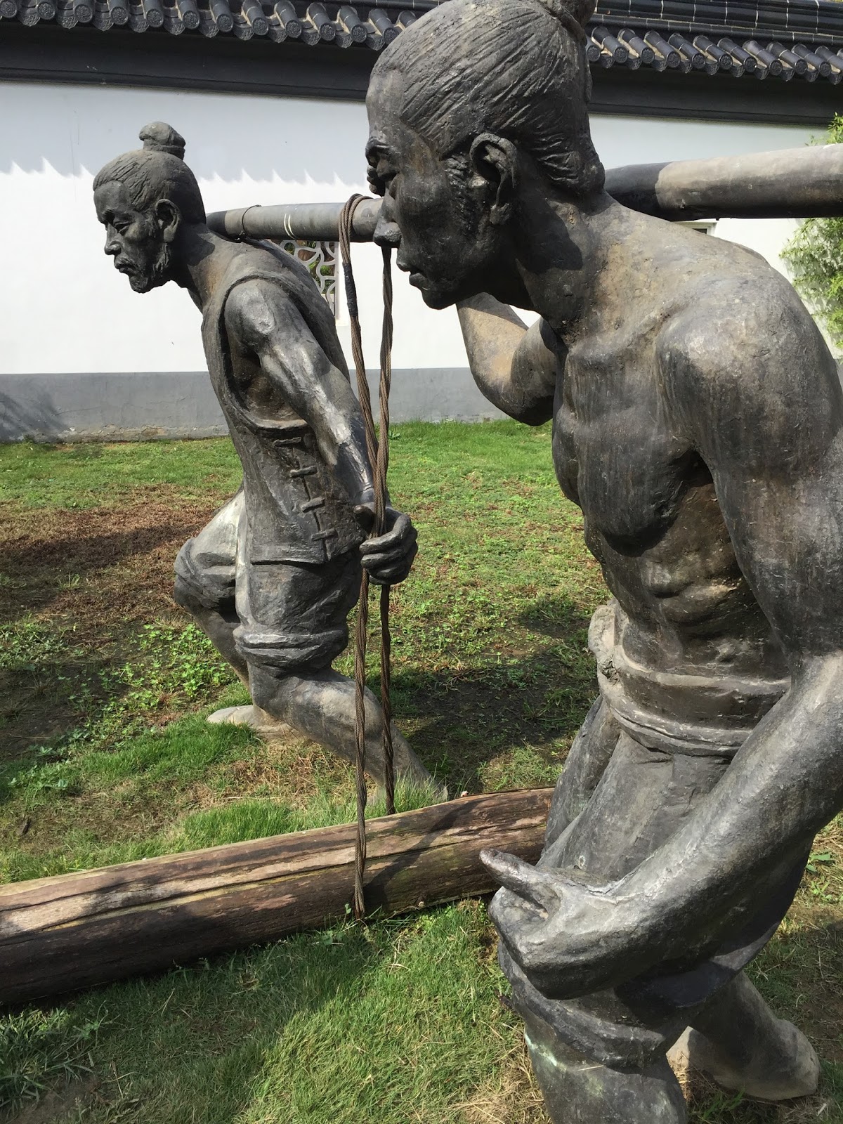 Zheng He’s tomb in Nanjing has been repaired and a small museum built next to it. We did not see the tomb, and anyway he is reported to have been buried at sea, but we traced the routes of the slips where the ships had launched, amazed to see teak timbers still in the ground and dating to that period. We went to the statue of Zheng He and visited the windlasses, steering wheels, and rudders from his ships, and two 2.5 m (8 foot) iron anchors weighing over a thousand pounds each, Walking among bronze statues of the shipyard workers, we watched a child play the giant ship’s bell from the Admiral’s flagship.