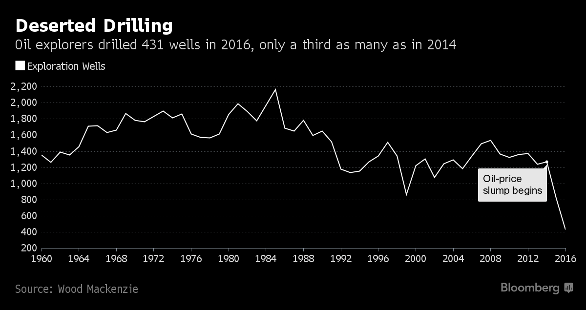Oil companies found only 3.7 billion barrels of so-called conventional crude in 2016, 14 percent less than the previous year and the lowest amount since 1952, according to updated figures from the Edinburgh-based consultant. The results for both 2016 and 2015 are better than forecast a few months ago, but still put discovered oil volumes at little more than a tenth of the yearly average since 1950.
