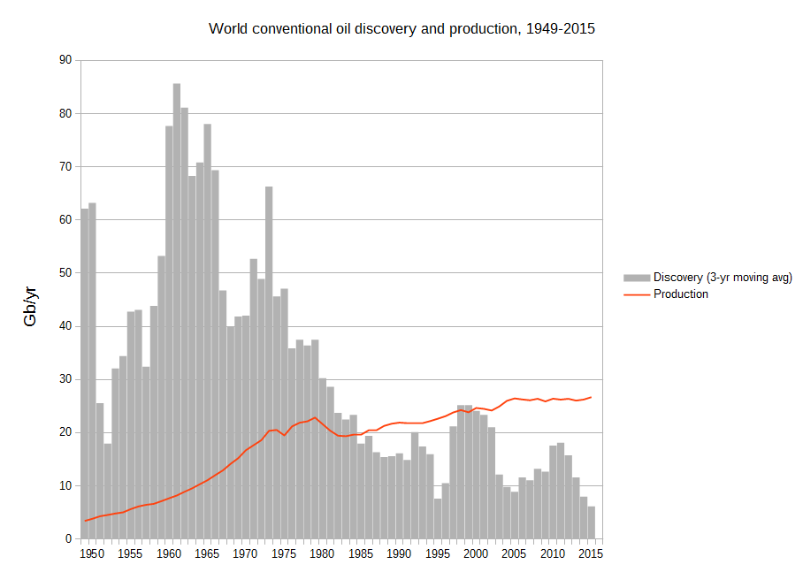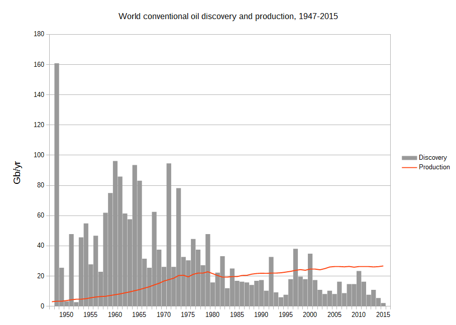 The following chart shows the digitized Wood Mackenzie conventional discovery data and the production data described above. According to the data, since 1980, when the gap between production and discovery began to appear, humanity has extracted about 47 percent more conventional oil than it has discovered.