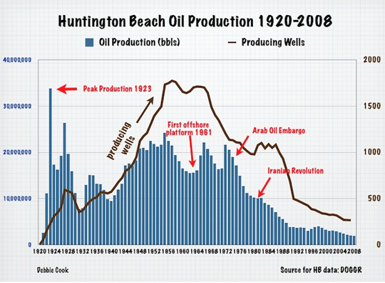 By 1923 it was producing some 259,000 bd from some 300 wells, in comparison with Huntington Beach, which was then at 113,000 bd and Santa Fe Springs at 32,000 bd. In combination they were producing, at the time, a quarter of the world’s petroleum. And, in a foreboding of the future problems of over production, this was the first year in a decade that supply exceeded demand.