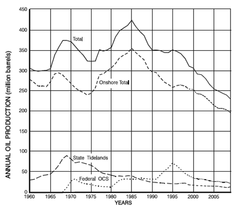 California’s overall oil production peaked in 1985, and is currently declining at around 3.3% a year, with 2009 production at around 630,000 bd, with the largest production at that time coming from the Midway-Sunset field at some 93,600 bd average production. In 2009 there were 2,570 wells completed to production in the state.