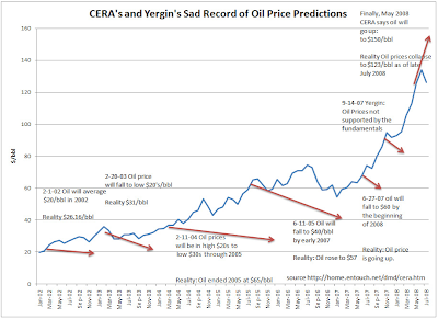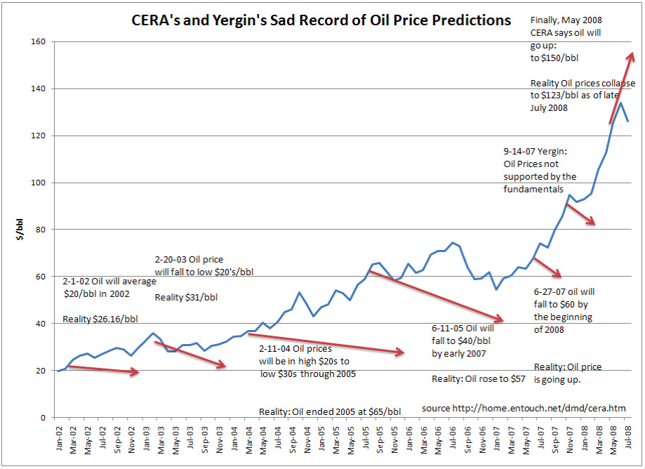 One extreme in this debate was what came to be known as cornucopians, epitomized by Daniel Yergin of the consultancy CERA. He made a long series of predictions that oil production would resume growing and prices would fall any day now. This was most famously satirized in a graph by Glenn Morton: