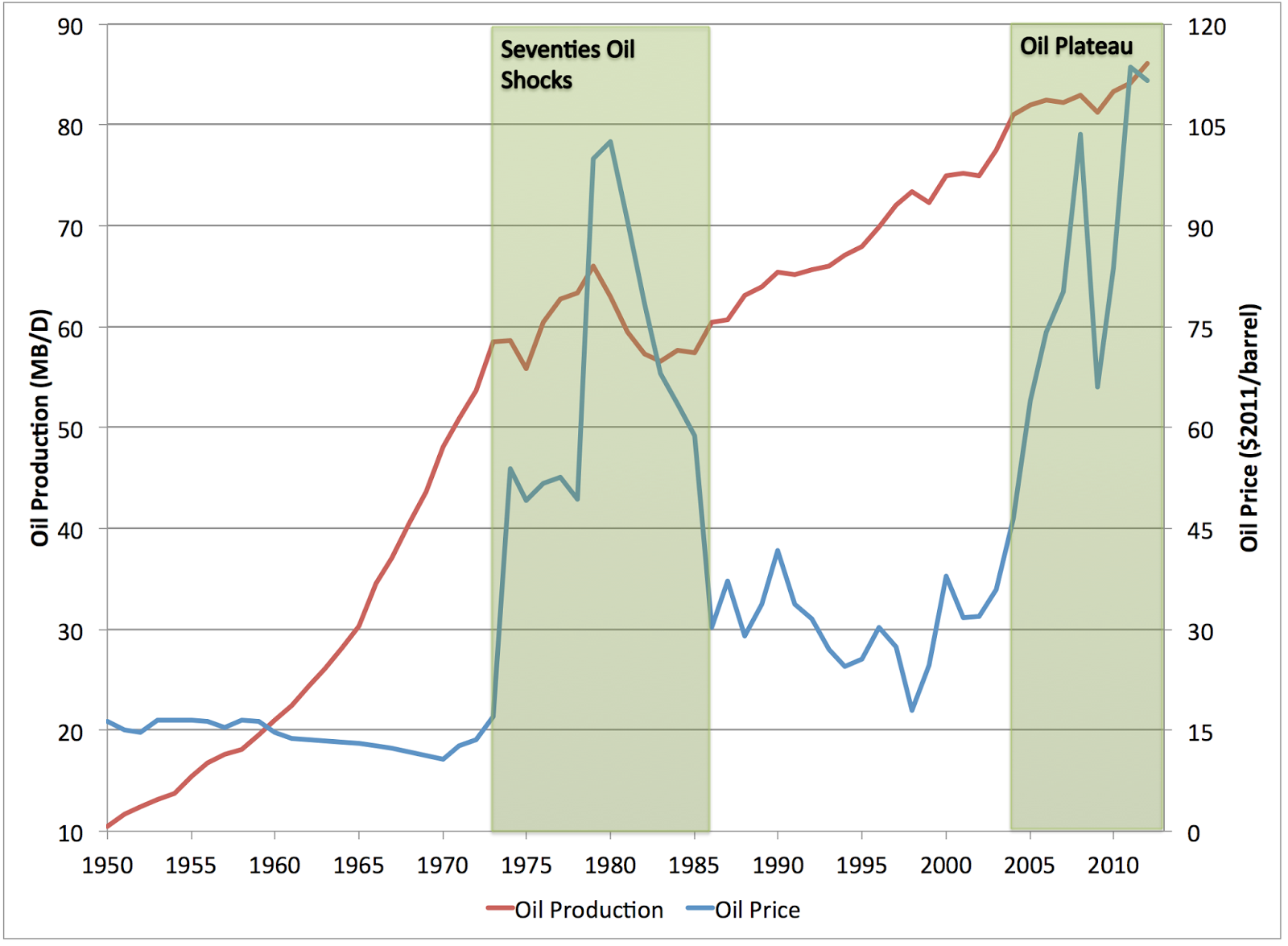 The orderly region from 1950 to 1973 was characterized by very rapid growth in oil production that was achieved at very modest oil prices (around $20/barrel in 2011 dollars).