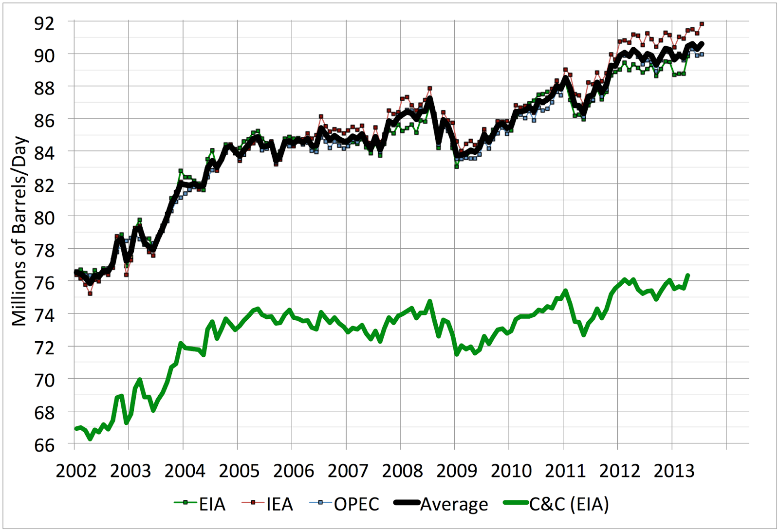 The crude-and-condensate curve is bumpy, but does slope upward slightly. The all liquids curve slopes up more, reflecting the fact that global natural gas production has increased steadily. High oil prices and government policies also induced a biofuel boom after 2005.