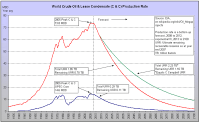 Another extreme in the debate were “doomers” who believed that global oil production would begin to fall very rapidly, very soon, because peak oil was upon us. “We’re all gonna die” was the logical implication. One such forecaster was TOD contributor Ace who produced a series of forecasts like this one which showed oil production beginning a precipitous decline as of the date of the forecast: