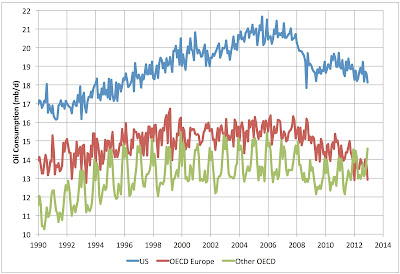 One final point worth making: while global oil production has not peaked, oil consumption by the developed OECD countries almost certainly has. Since China, India, the Middle East, etc are all growing their production rapidly, and global supply is almost stagnant, OECD consumption must decline, and it has been: