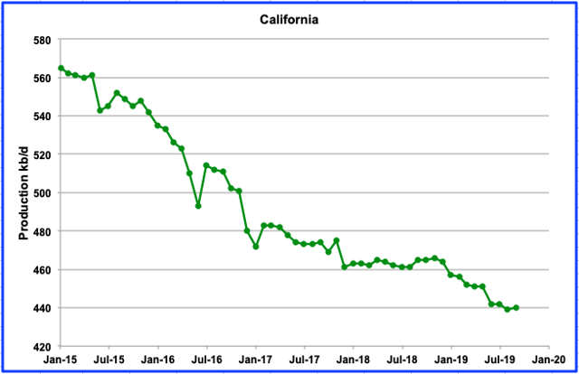 California production has been flat since June at 440 kb/d. Since 2017, production appears to be going through a step process of a flat period and then a ramp down. The bottom line is that there is little sign of recovery.