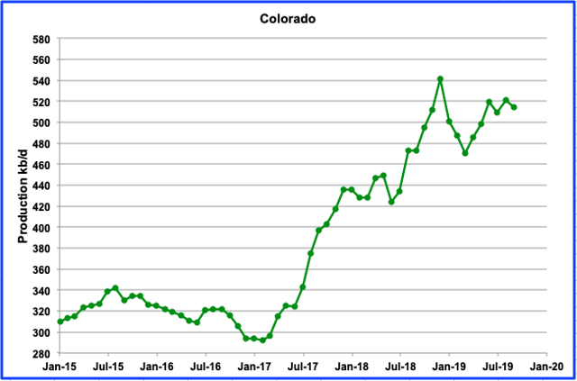 Colorado’s September production has been on a plateau since June between 510 kb/d and 520 kb/d, possibly due to new regulations. However, according to the Colorado CPR news, All systems are “Go” for Colorado oil and gas.