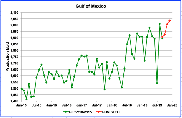 Despite the addition of a total 234 kb/d of new production in 2019 and 2020, the STEO does not expect the GOM production to exceed 2,050 kb/d in the first half of the year before seasonal maintenance will drop production below 2,000 kb/d.