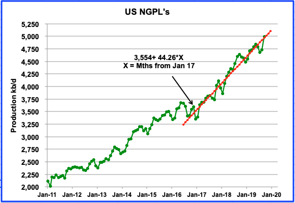 While the focus of this post is on US C + C production, we cannot ignore the increasing amounts of NGPLs being produced in the US. When the IEA and OPEC report on US oil production, they also include the NGPLs. Adding the two, total oil US production for September would be 17,452 kb/d. Since January 2017, NGPLs production has been growing at the rate of 44.26 kb/d/mth.