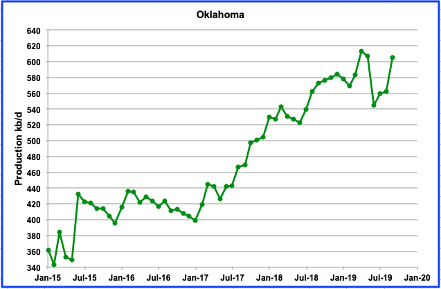 Oklahoma’s September production increased by 43 kb/d to 605 kb/d. This is a large increase relative to production from June to August. What is surprising is that a June report indicated a loss of interest by drillers in Oklahoma. According to the headline in Reuters, “Interest dims in Oklahoma shale play as drilling results disappoint.” Apparently the geology has stymied hopes for a “Permian Jr”: “Exploration wells pointed toward uniform rocks that produced high levels of oil, but producers instead encountered more complexity underground, and production weighted toward gas – at a time of a global glut and stubbornly low prices for the commodity.”