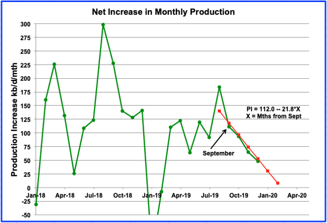 The initial growth estimate for 2019 indicates a slower growth rate for 2019 vs. 2018. In 2018, growth to September 2018 was 1,432 kb/d. For 2019, it is 426 kb/d, ~30% of the 2018 growth rate. So, while US production is growing, yearly growth is slowing.